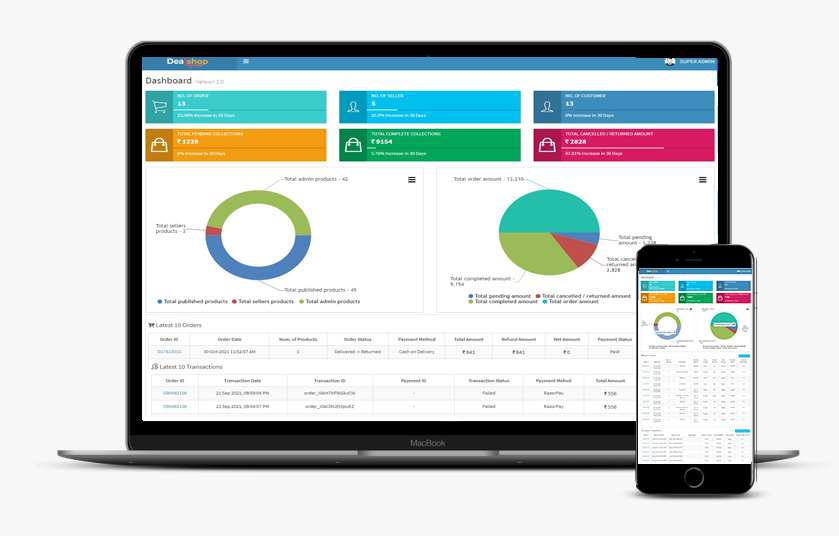 Admin will have access to all modules and from panel admin total how many products are listed how many orders recieved and total number of seller's products are registered.